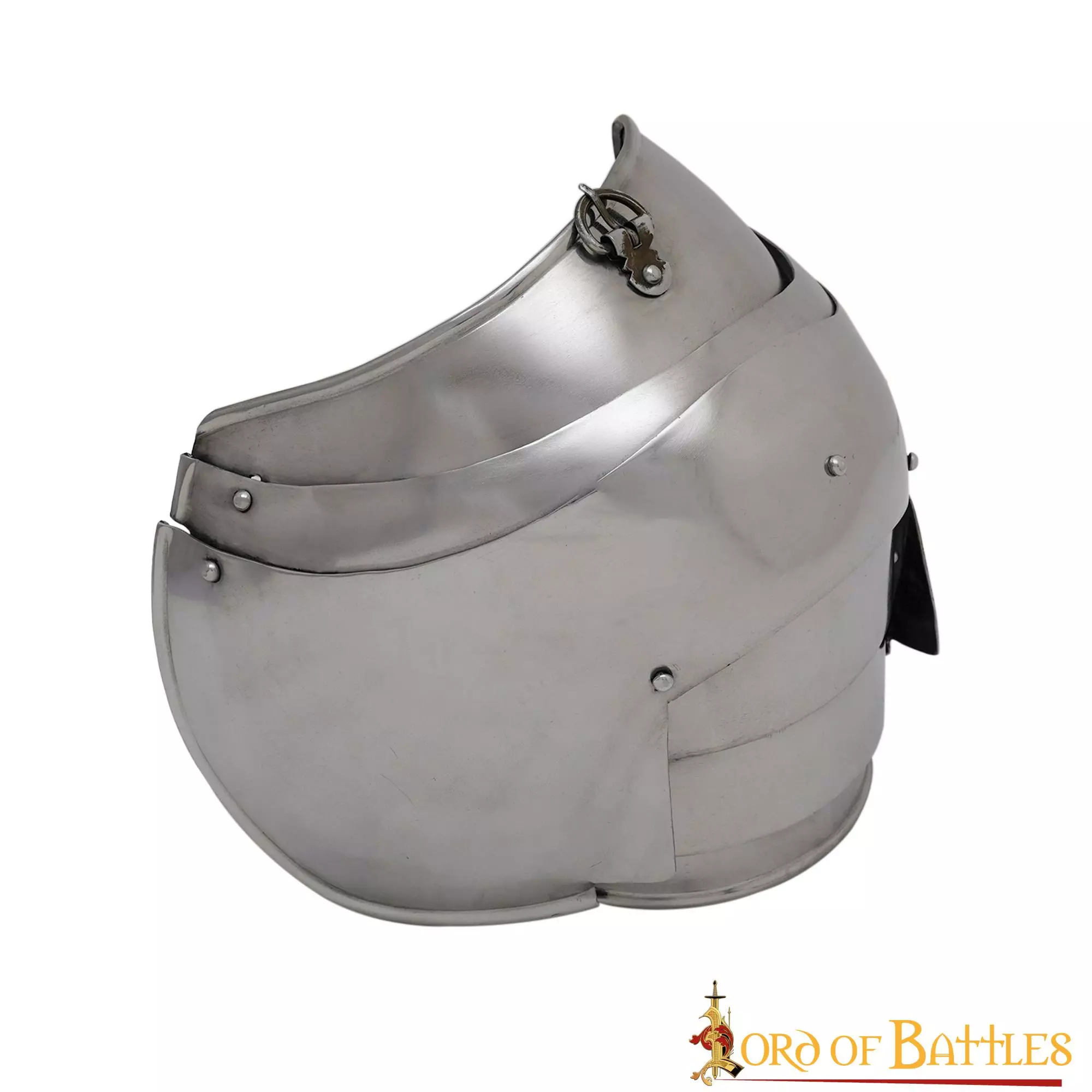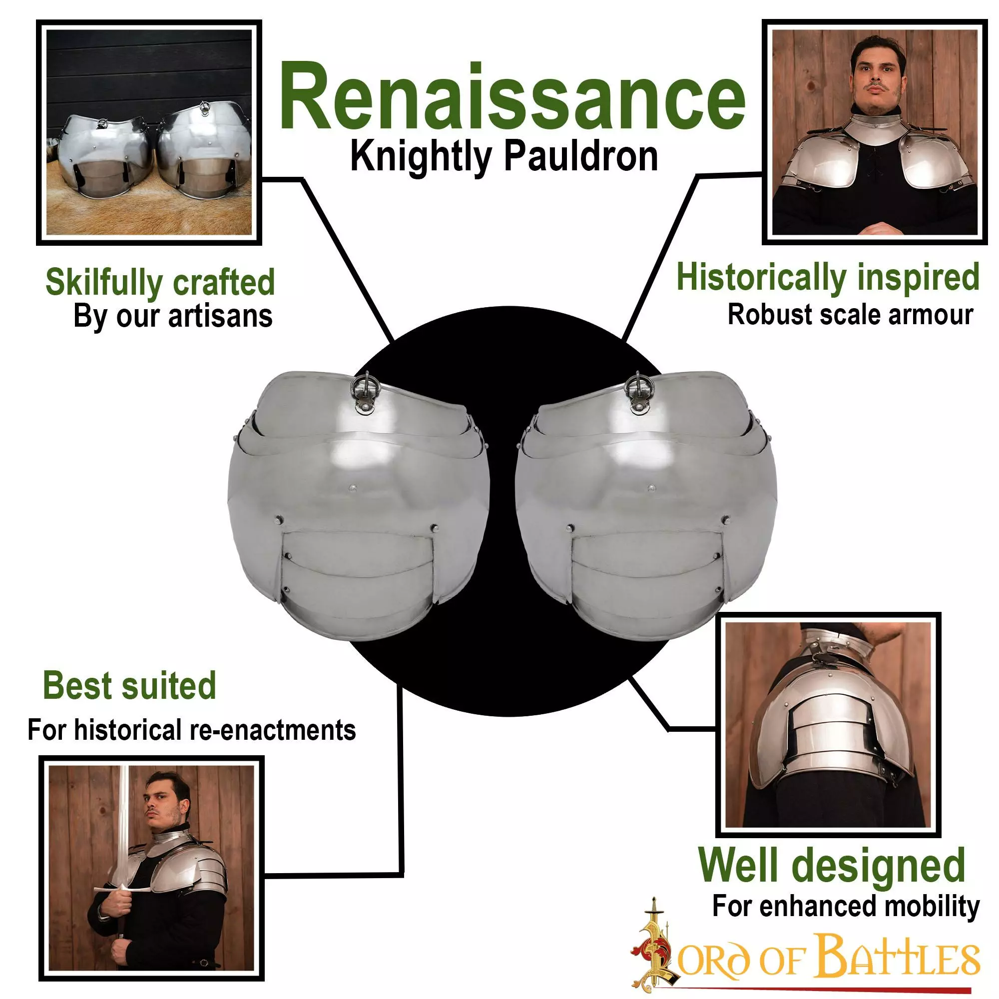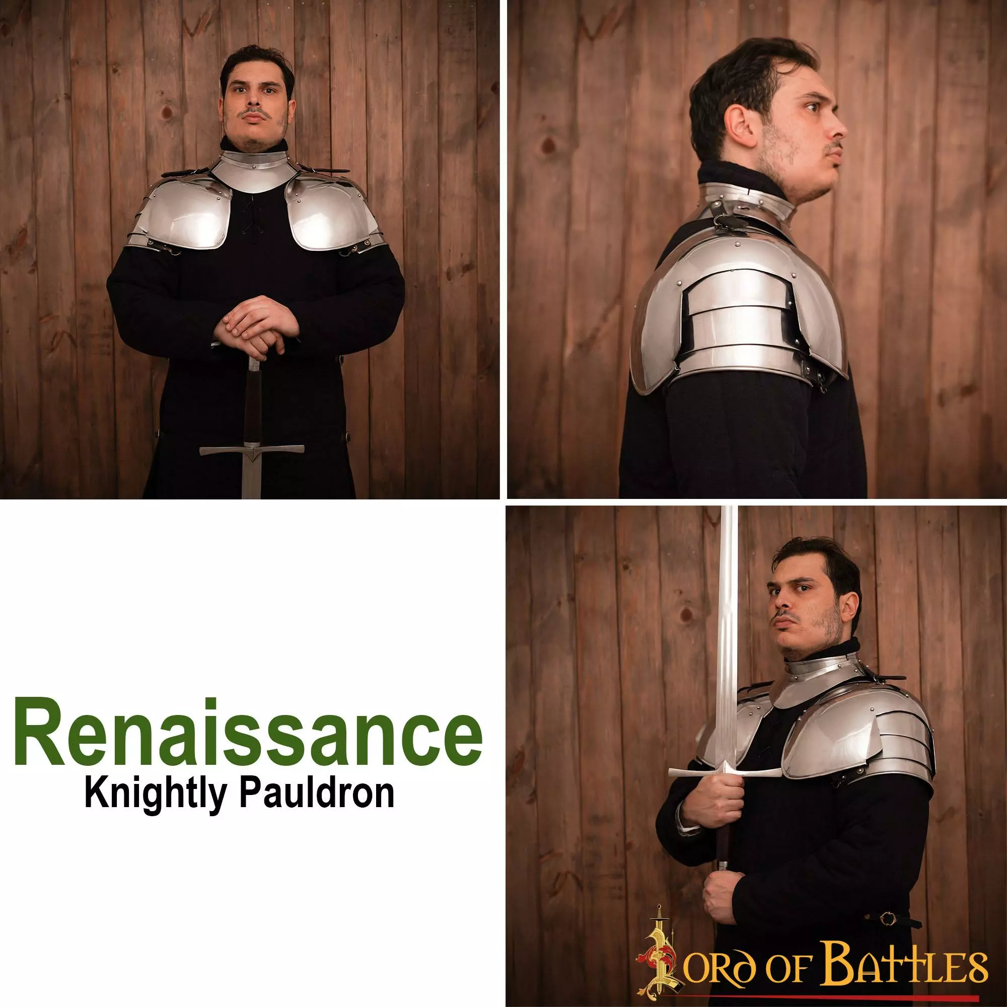 Nuestro juego de pañolones renacentistas está bien articulado para aumentar la flexibilidad y la amplitud de movimiento. Ambos tienen hebillas centrales de acero resistente que pueden anclarse fácilmente a las correas de cuero de una gorguera o pechera.