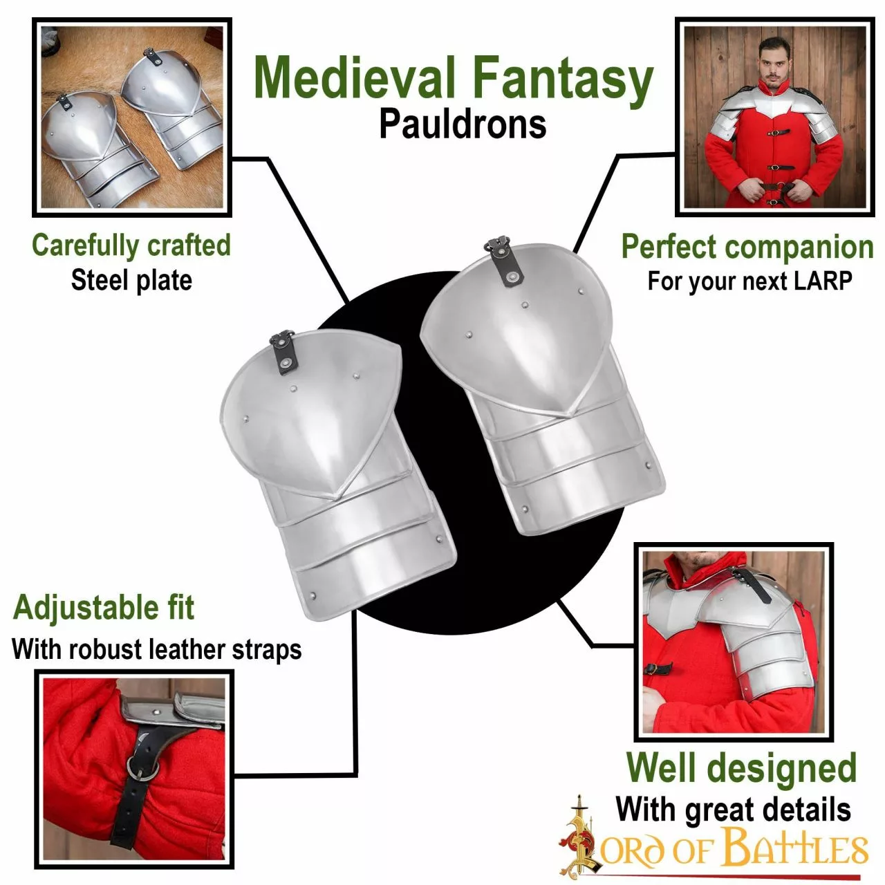 Nuestros pauldrons soldado de fantasía medieval están bien articulados para una mayor flexibilidad y amplitud de movimiento. Ambos tienen hebillas centrales de acero resistente que pueden anclarse fácilmente a las correas de cuero de una gorguera o pechera para que resulten cómodos de llevar.