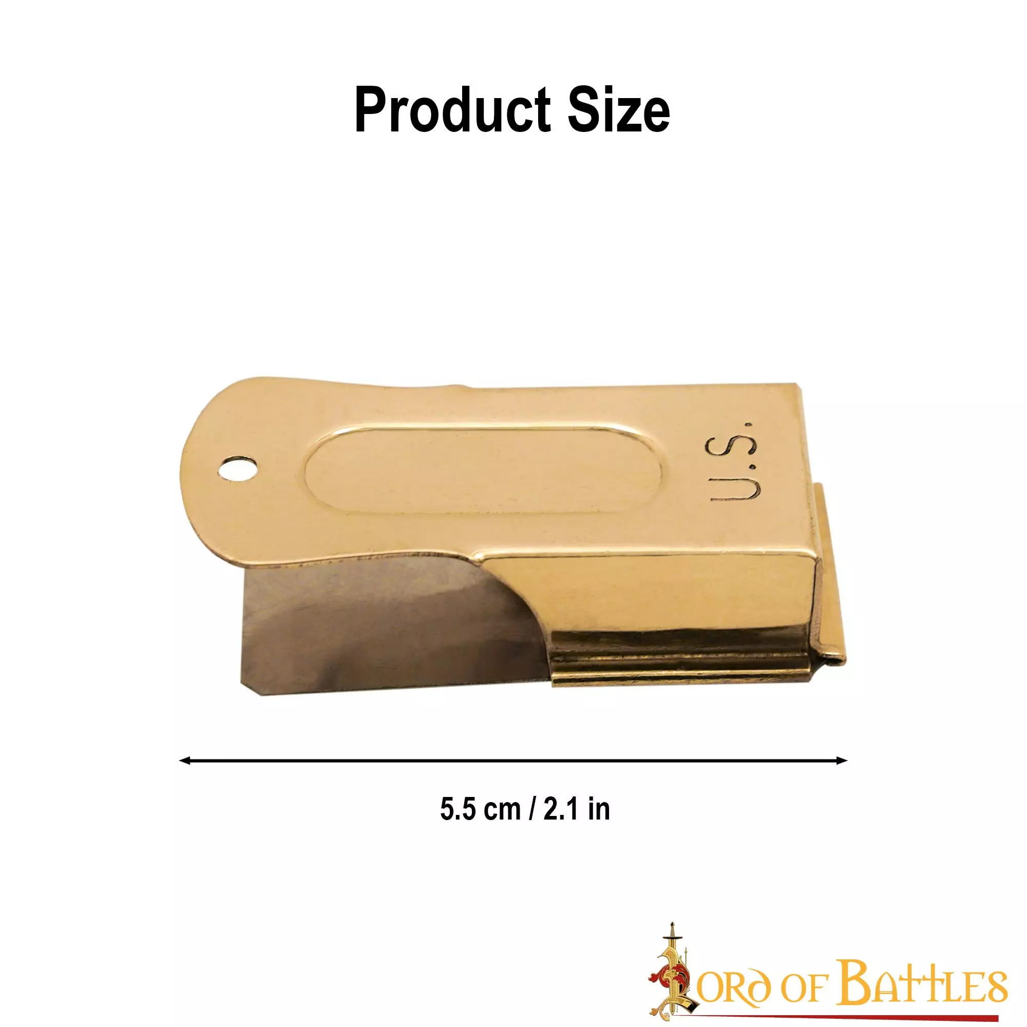Está bien diseñado a partir de LATÓN SÓLIDO PURO, con una placa de acero unida, lo que garantiza su longevidad y durabilidad. Viene con un agujero en un extremo para que puedas pasarle un cordón (disponible por separado) que te ayudará a transportarlo fácilmente. El frontal de latón tiene una longitud de unos 5,2 cm, la placa de acero tiene una longitud de unos 5 cm y la estructura total mide unos 1,3 cm de ancho. Tiene un orificio en la parte delantera para que puedas pasarle un cordón (cordón de cuero disponible por separado) y llevarlo fácilmente, ¡allá donde vayas!