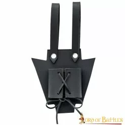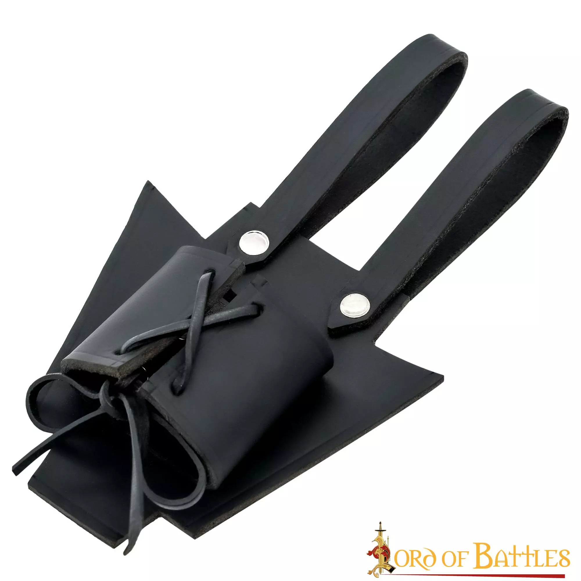 Está meticulosamente HECHO A MANO de CUERO BUFF GENUINO. El soporte tiene cuerdas ajustables para anchuras variables de armas (para diferentes espadas y hachas). Las trabillas están unidas a la rana con remaches de latón antiguo que pueden ajustarse fácilmente a un cinturón de 10cm de ancho. Sus dimensiones son aprox. (13 X 13,5) cm.