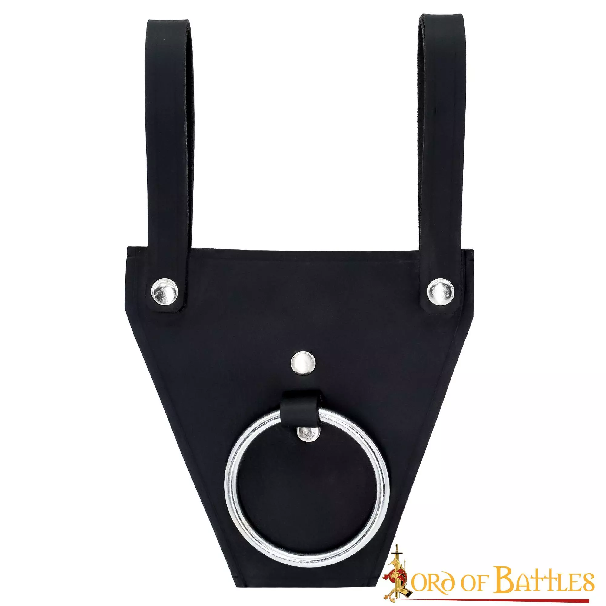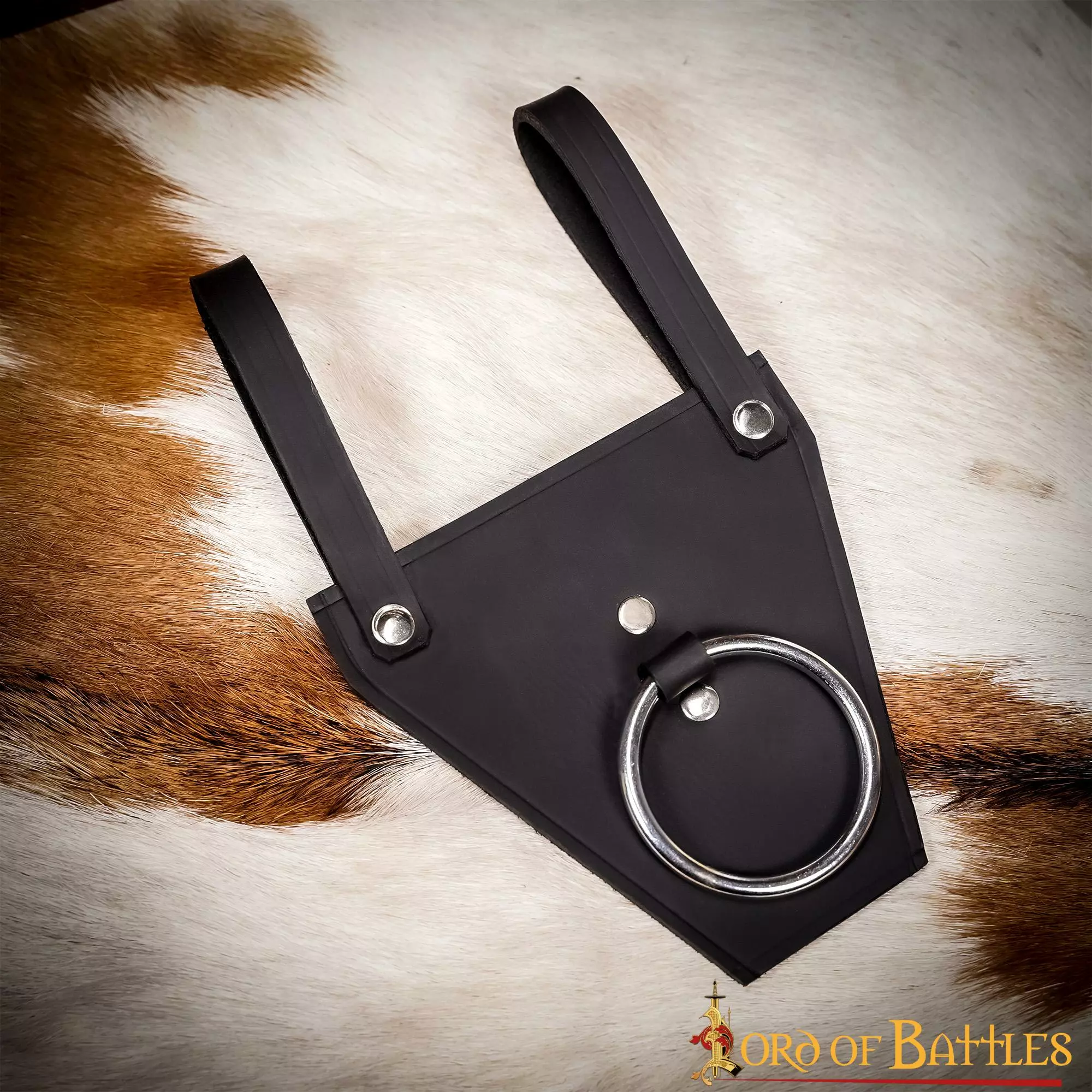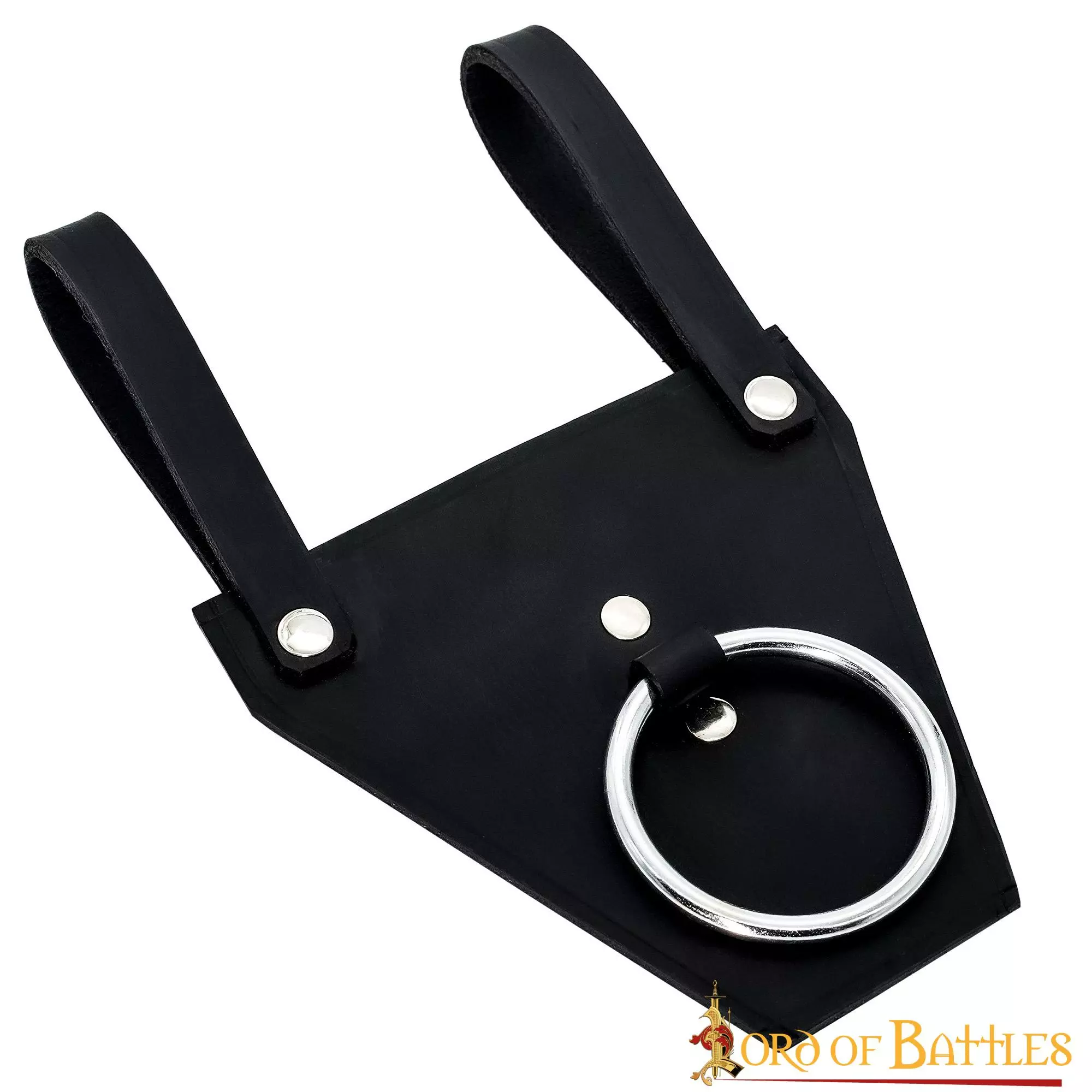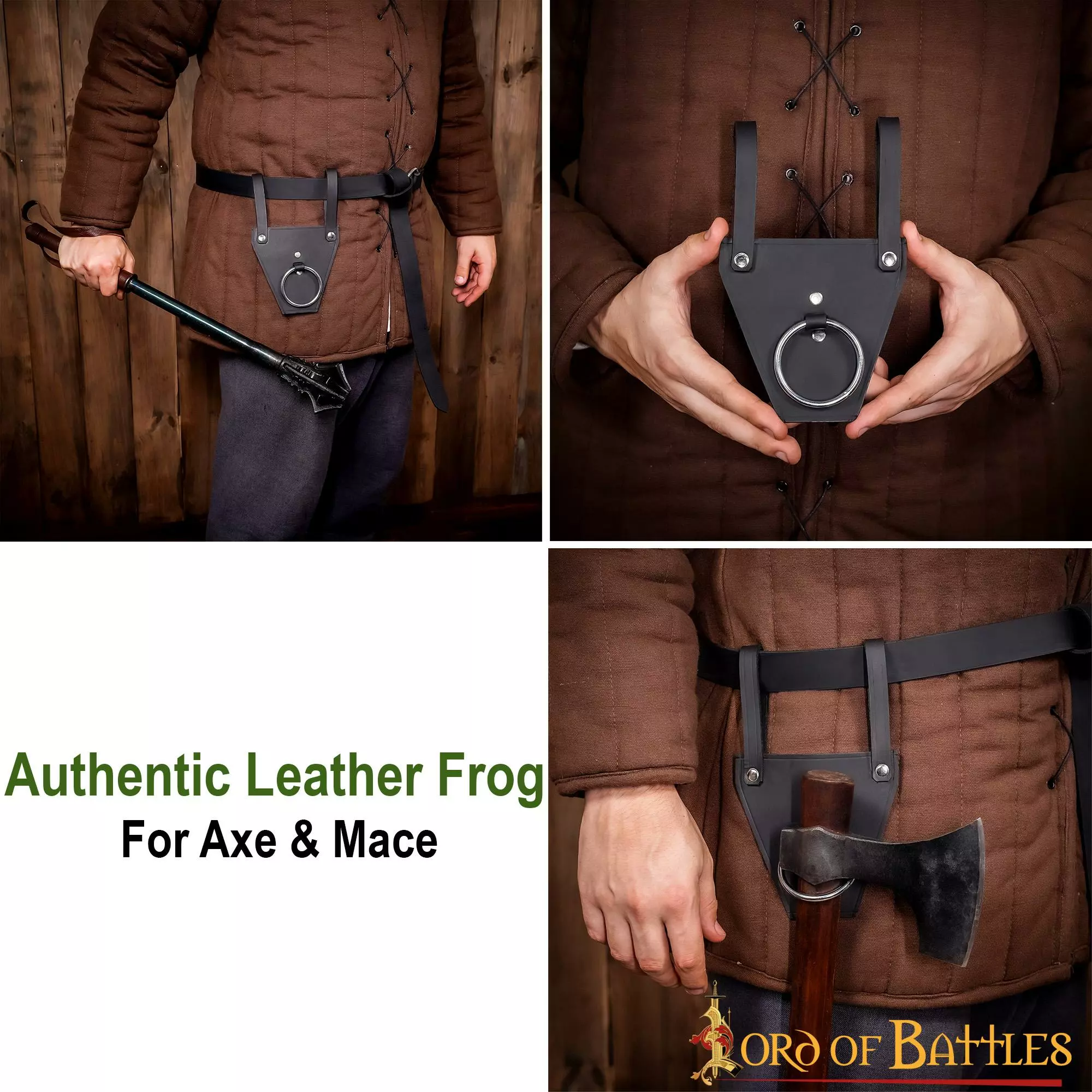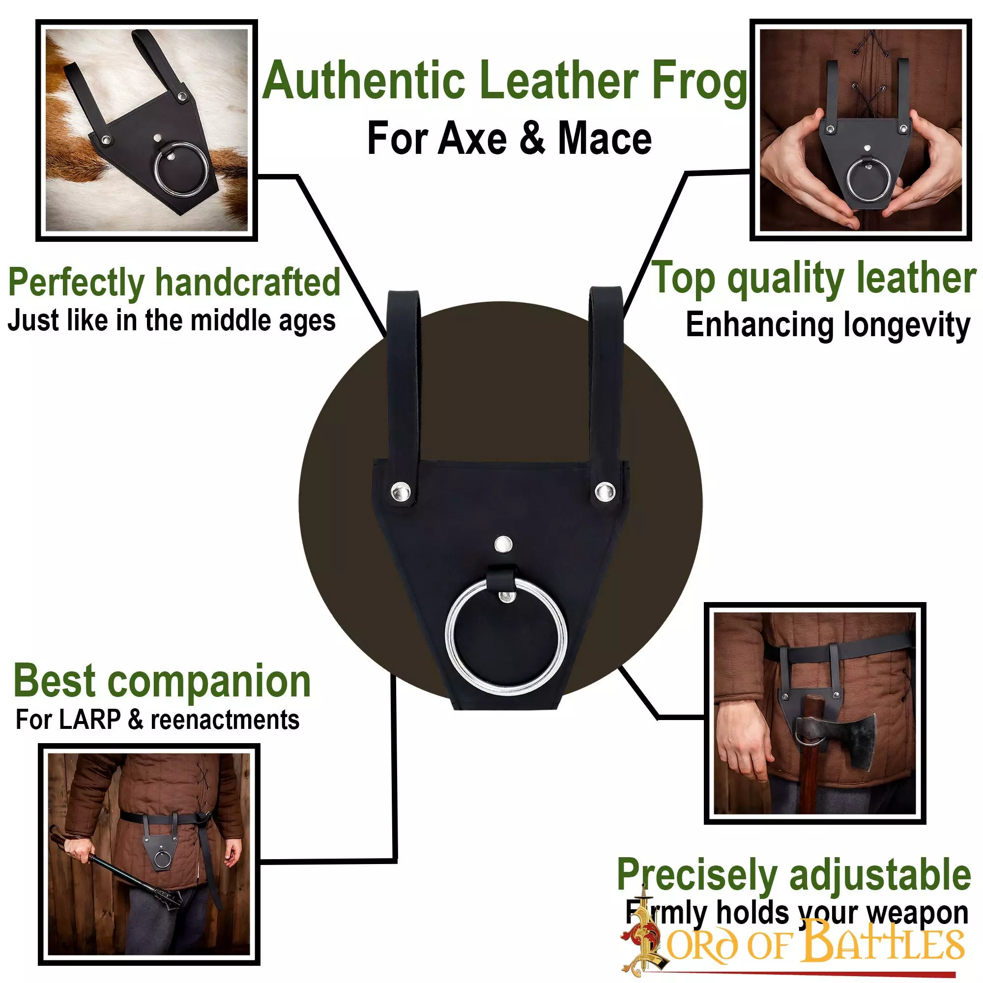 Nuestra rana medieval de cuero negro sujetará siempre su maza o incluso un hacha. La anilla de acero está unida a la rana mediante un lazo de cuero remachado. ¡Así que lleva tus duras hachas y mazas a tu próximo combate en esta magnífica rana de cuero!