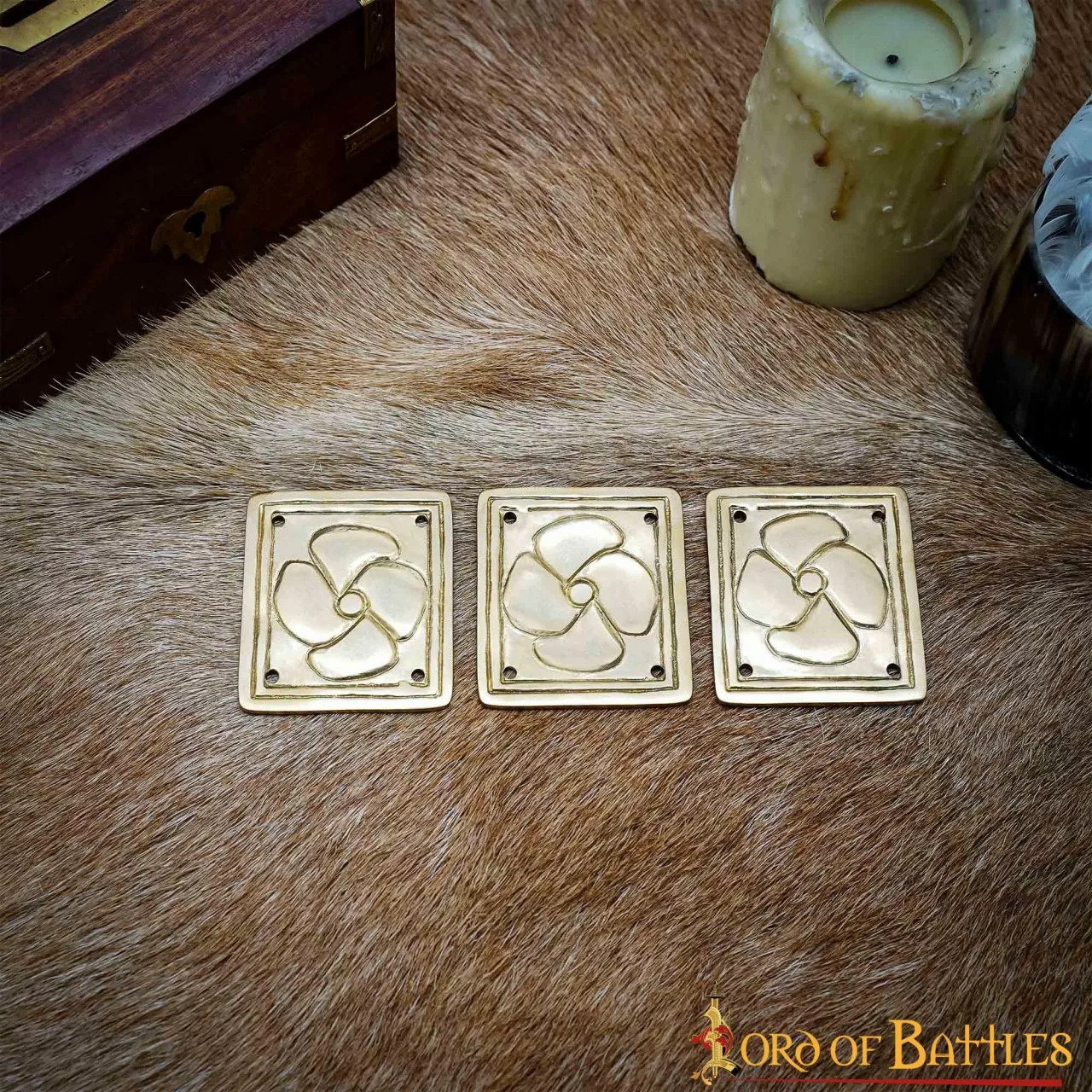 Nuestro juego de ADORNOS ROMANOS está fabricado en LATÓN PURO y mide aproximadamente 5,8 cm de largo y 5 cm de ancho. Para que le resulte más fácil adornar su cinturón como un destacado accesorio romano, proporcionamos este conjunto de adornos con un juego de botones de latón antiguo de 10 mm.