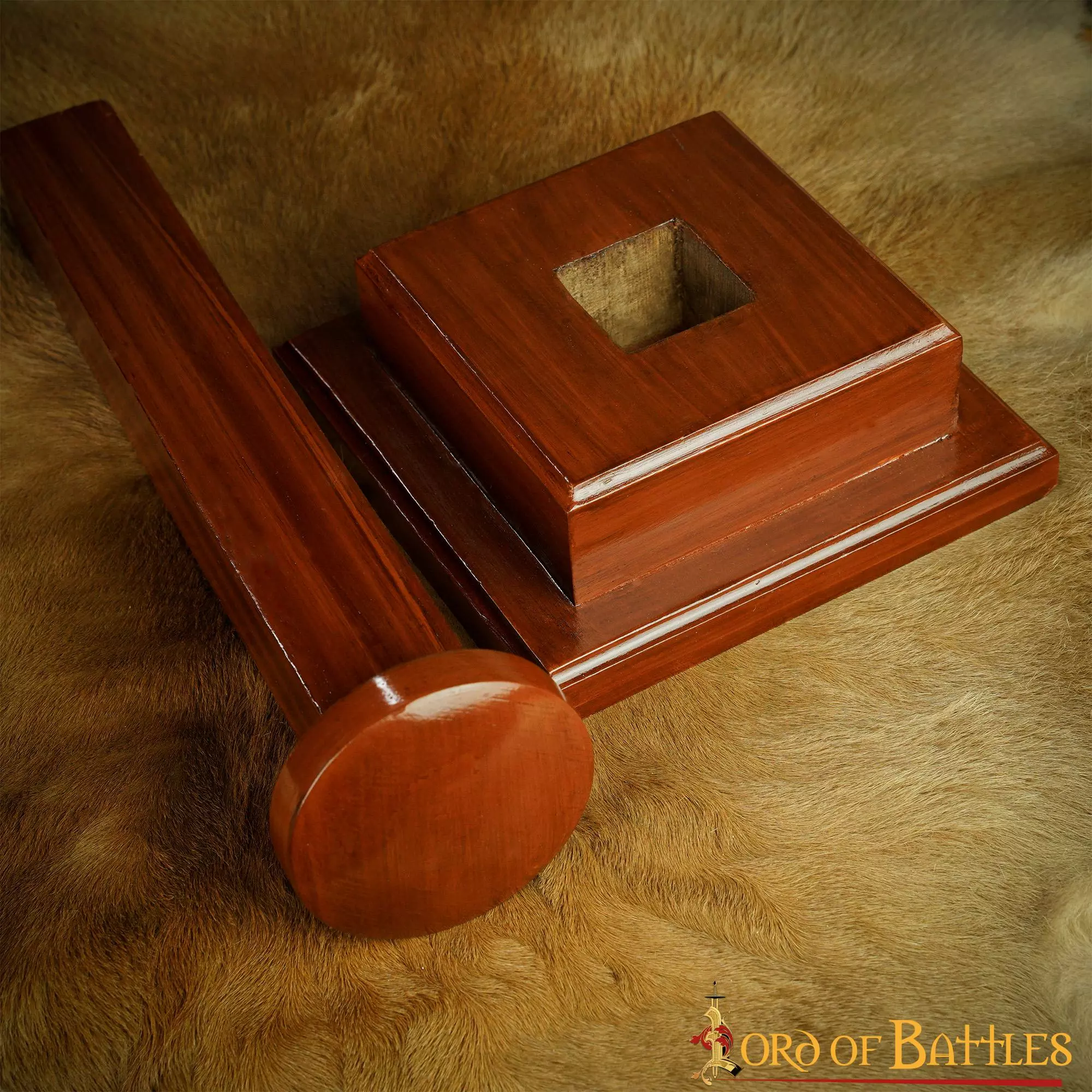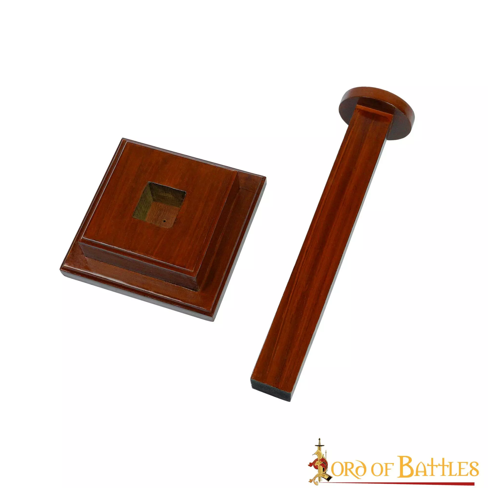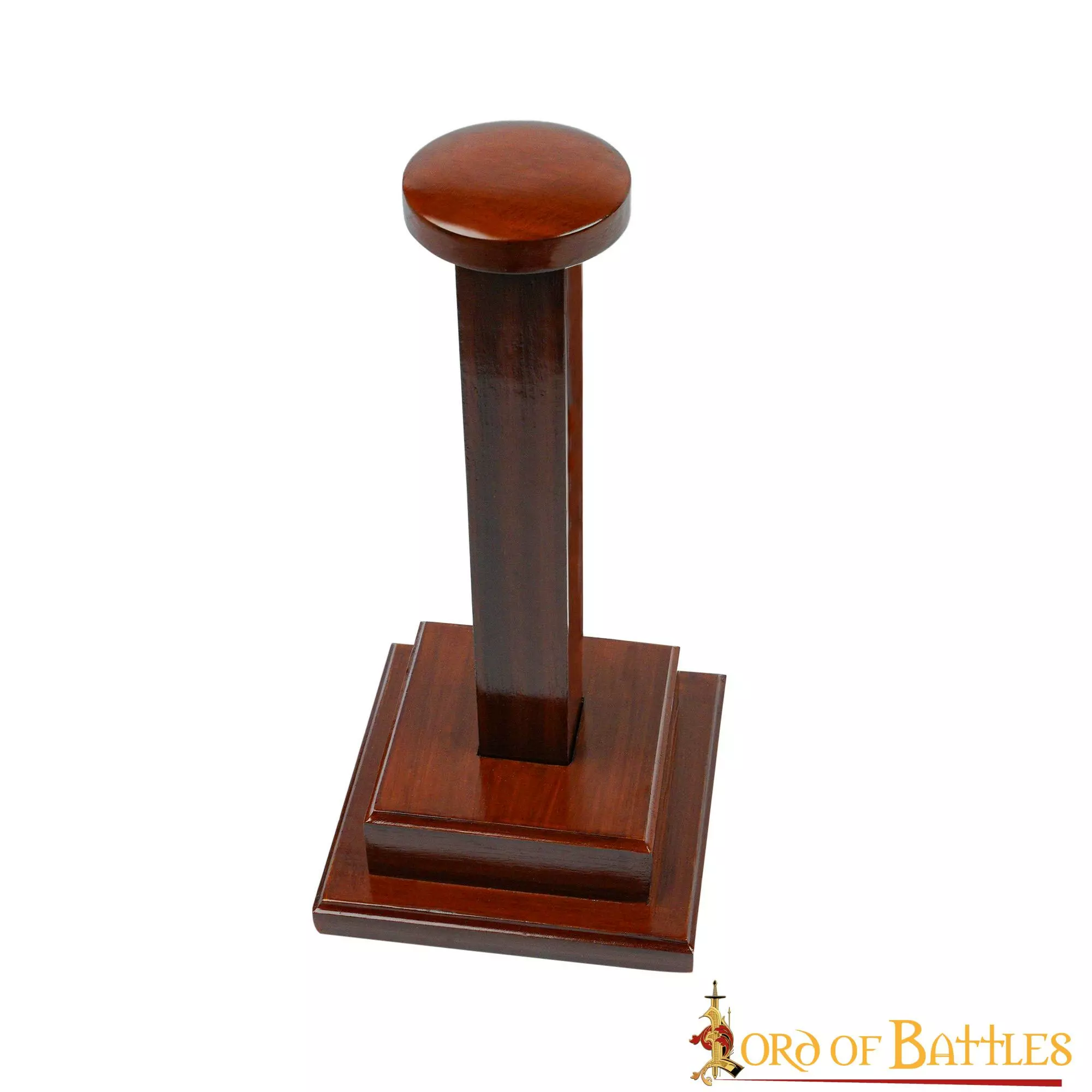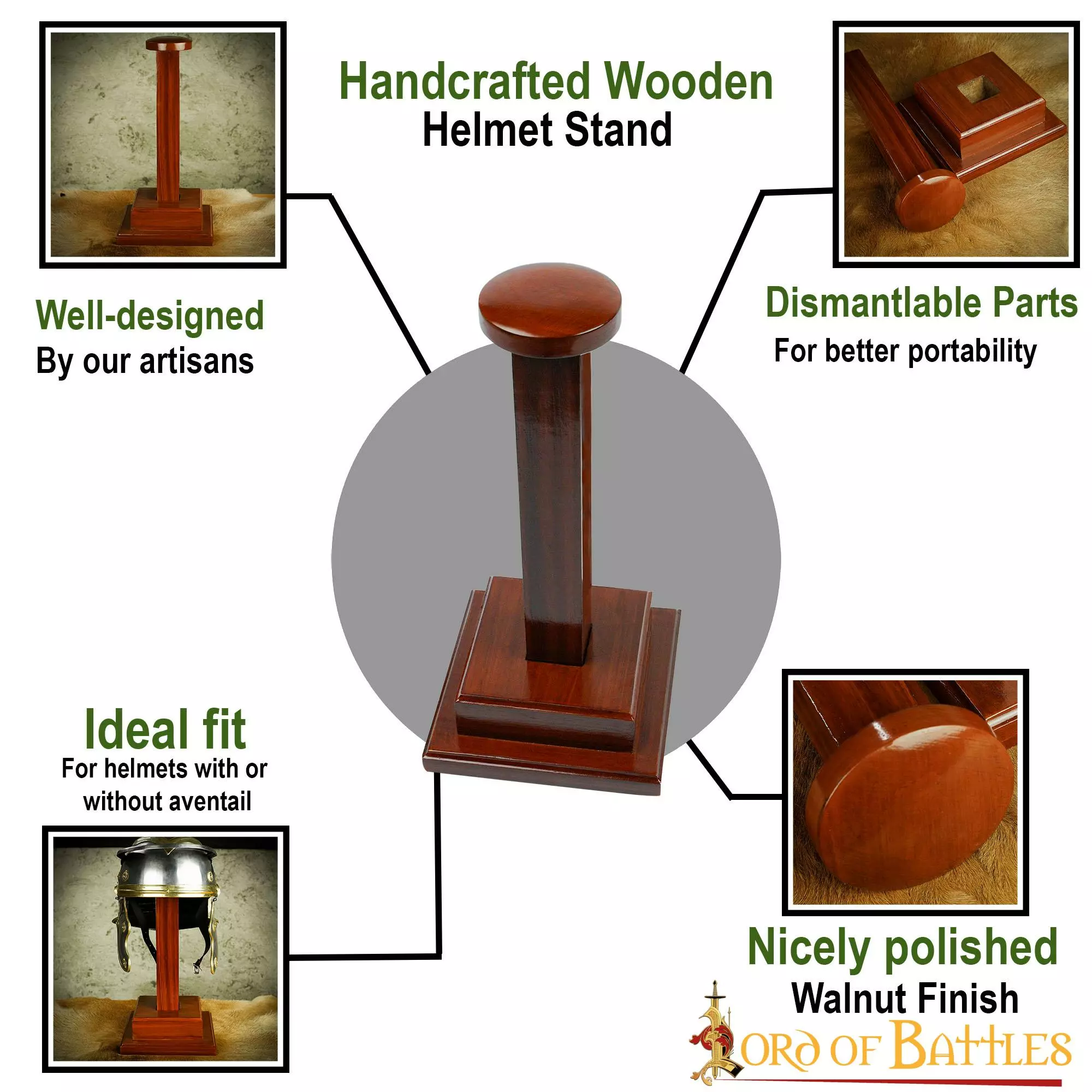 Está minuciosamente fabricado a mano con MADERA REAL, pulida con un acabado de nogal. Se presenta en dos unidades, una base y un astil, que se desmontan para una mejor portabilidad. Un amplio pedestal de 9,5 cm de diámetro lo hace adecuado para sus yelmos medievales. La longitud del asta es de aprox. 38 cm, y la base mide aprox. (19 X 19) cm. La longitud total del soporte es de aprox. 41,9 cm.