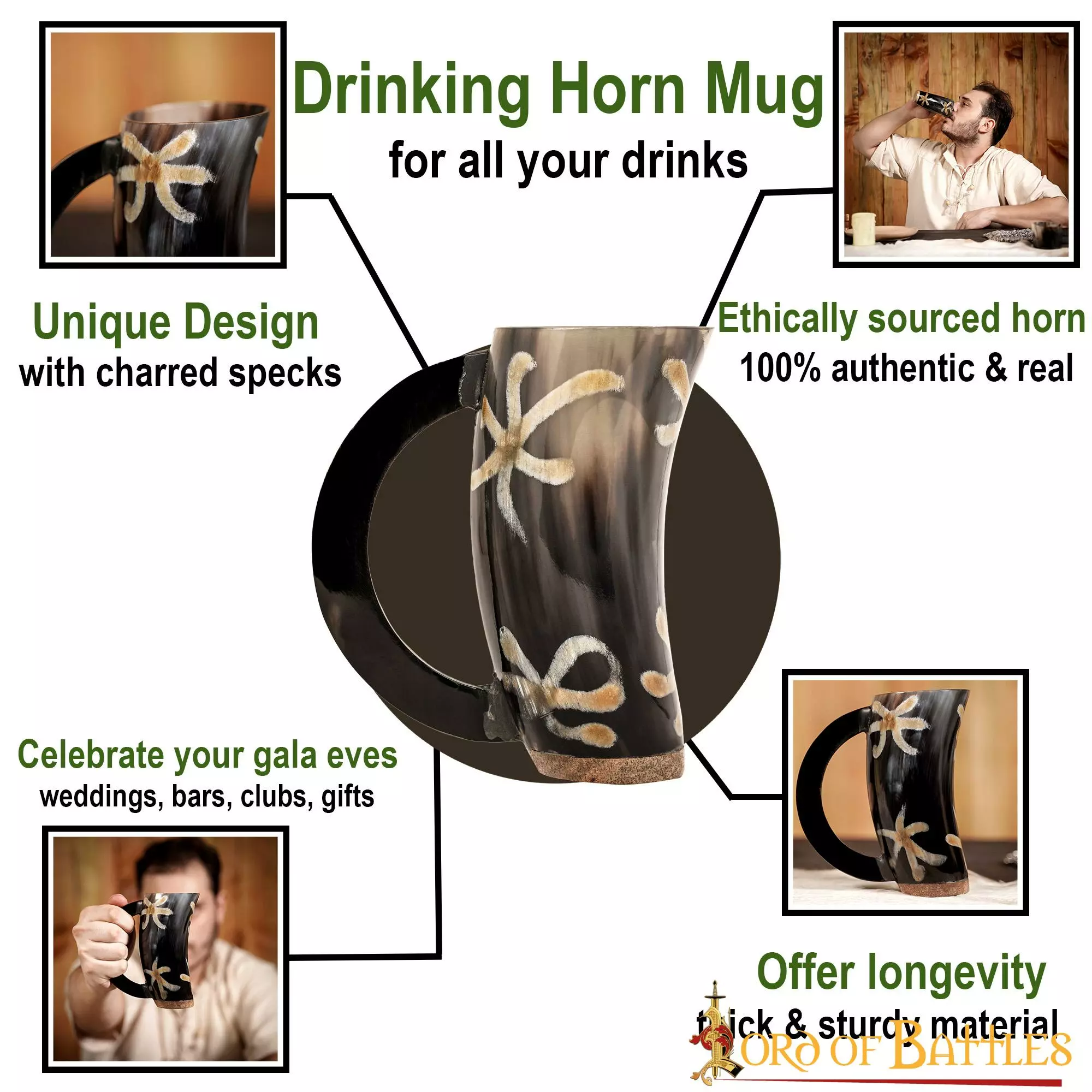 Para que pueda sorber cómodamente sus bebidas o incluso alguna cerveza fría, se ha provisto de un asa de cuerno, fuertemente clavada a la taza. Está meticulosamente HECHA A MANO con CUERNO DE BUEY REAL y AUTÉNTICO, con una capacidad aproximada de 250 ml. Es 0% a prueba de fugas; adecuado para líquidos fríos que tengan hasta 20% de contenido de alcohol. Por favor, evite el uso de lavavajillas y líquidos calientes; antes de usar, asegúrese de lavar con agua corriente. Para prolongar su vida útil, trátelo con cera de abeja después de cada uso. Tenga en cuenta que se trata de un producto natural que se descompone con el tiempo, por lo que pueden aparecer grietas.