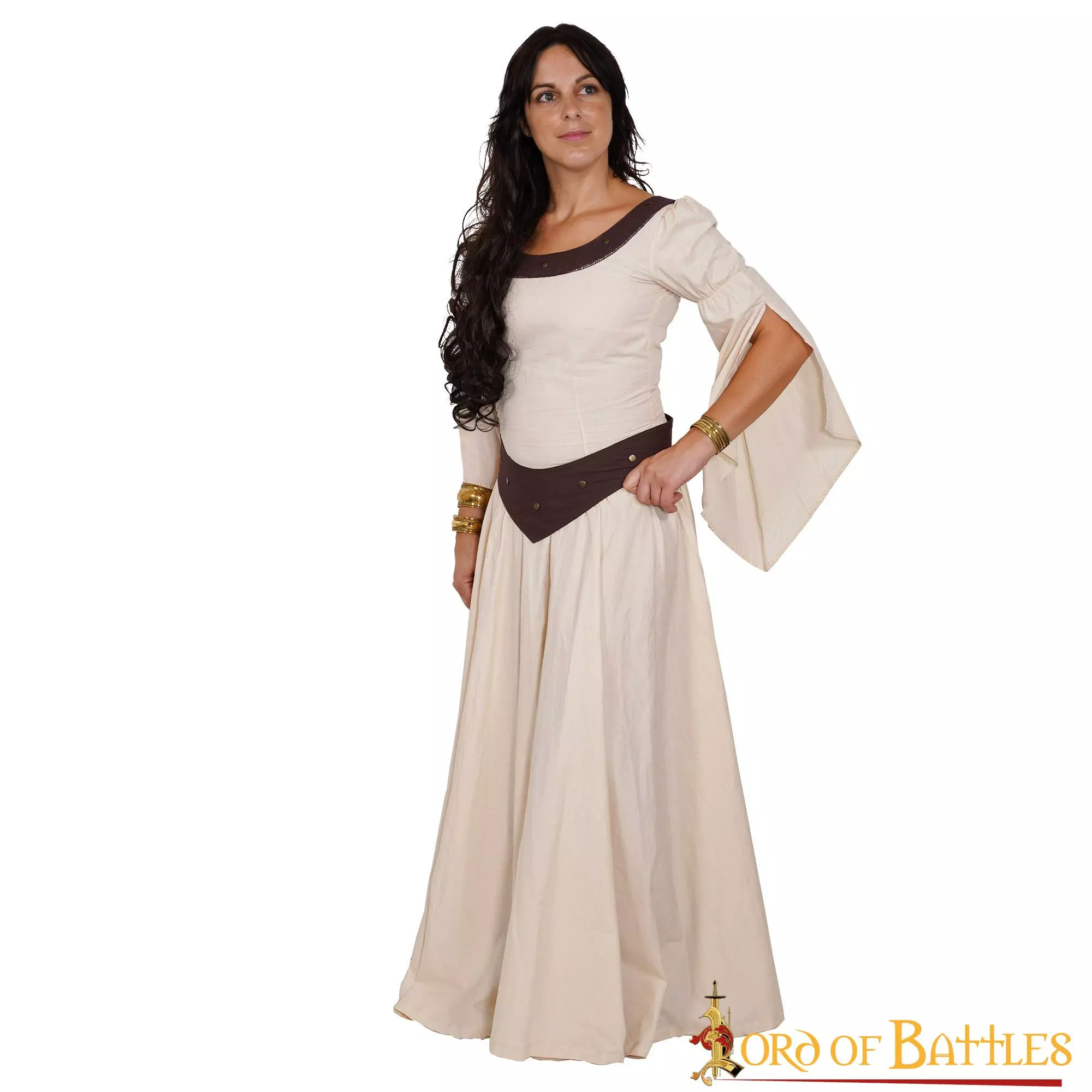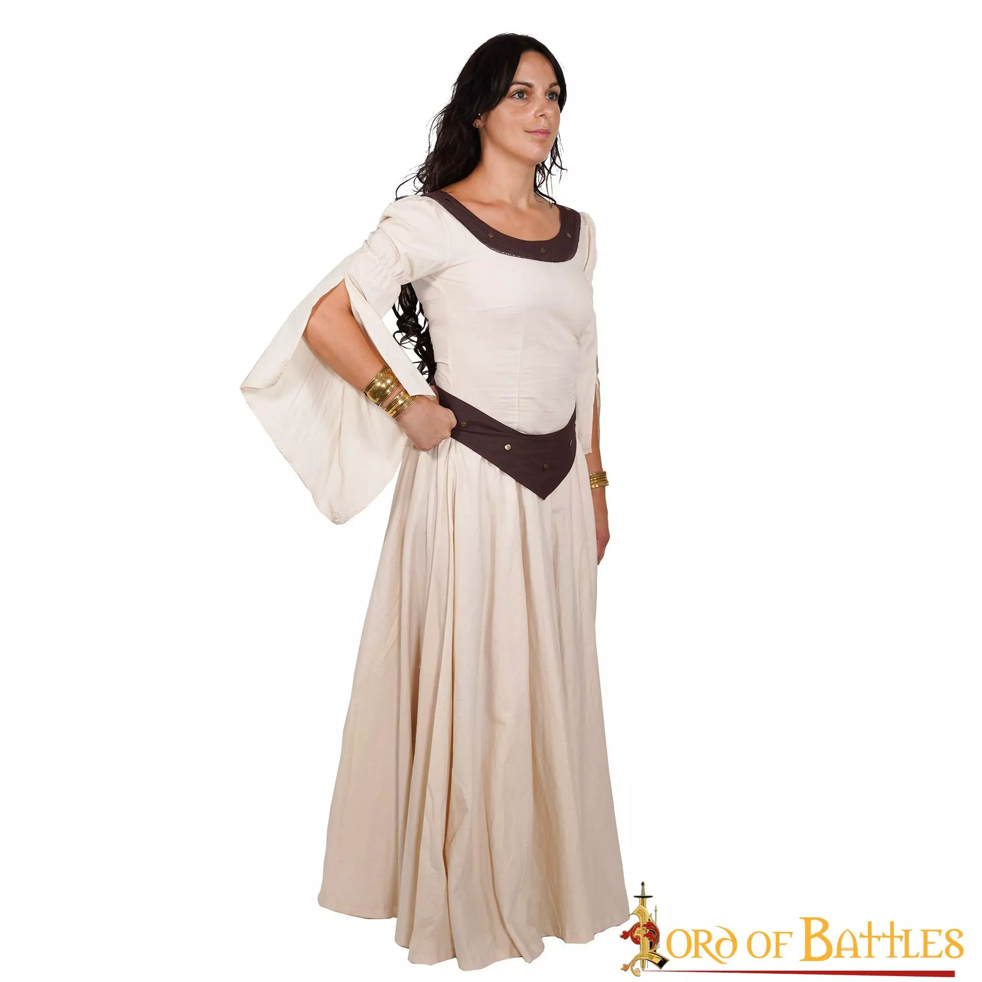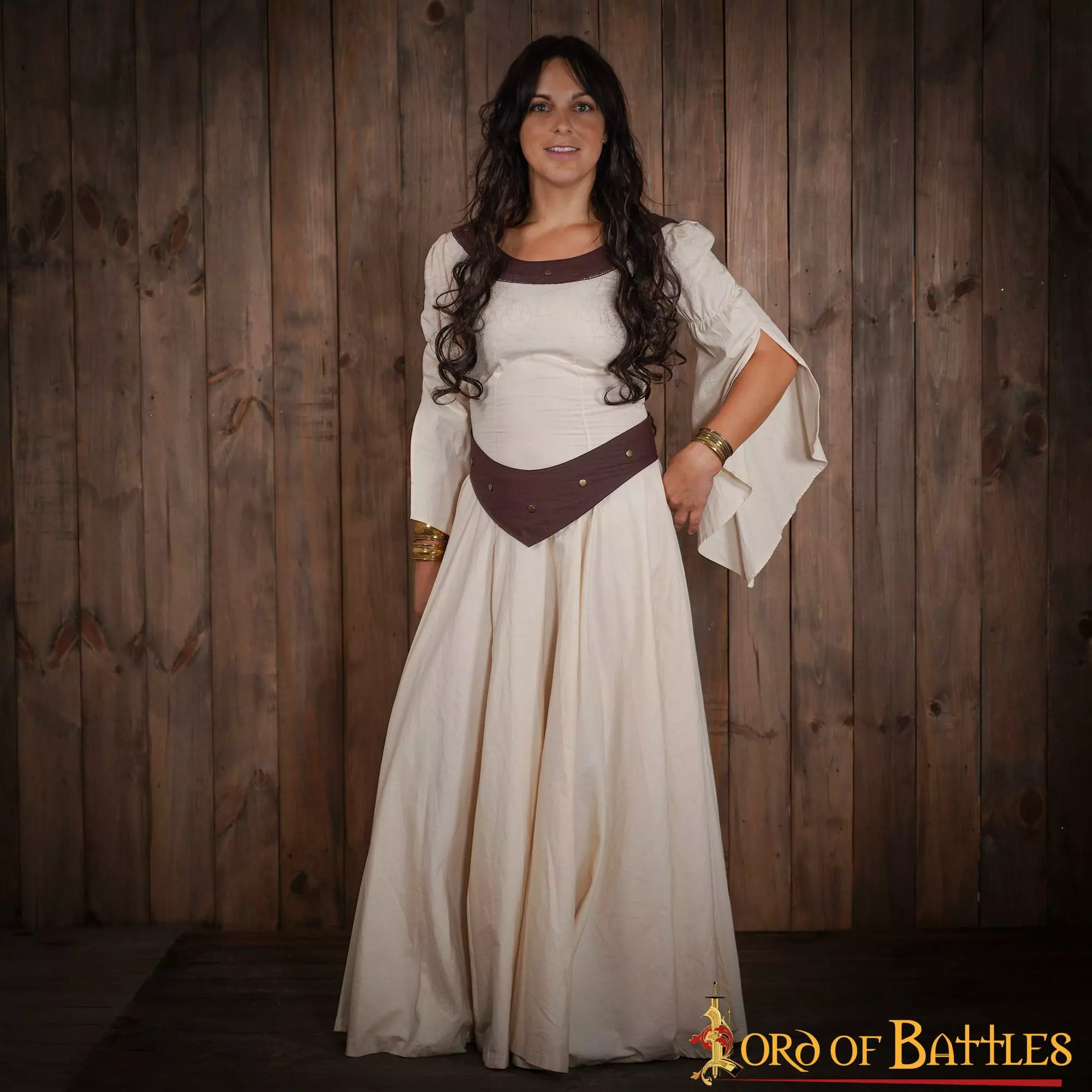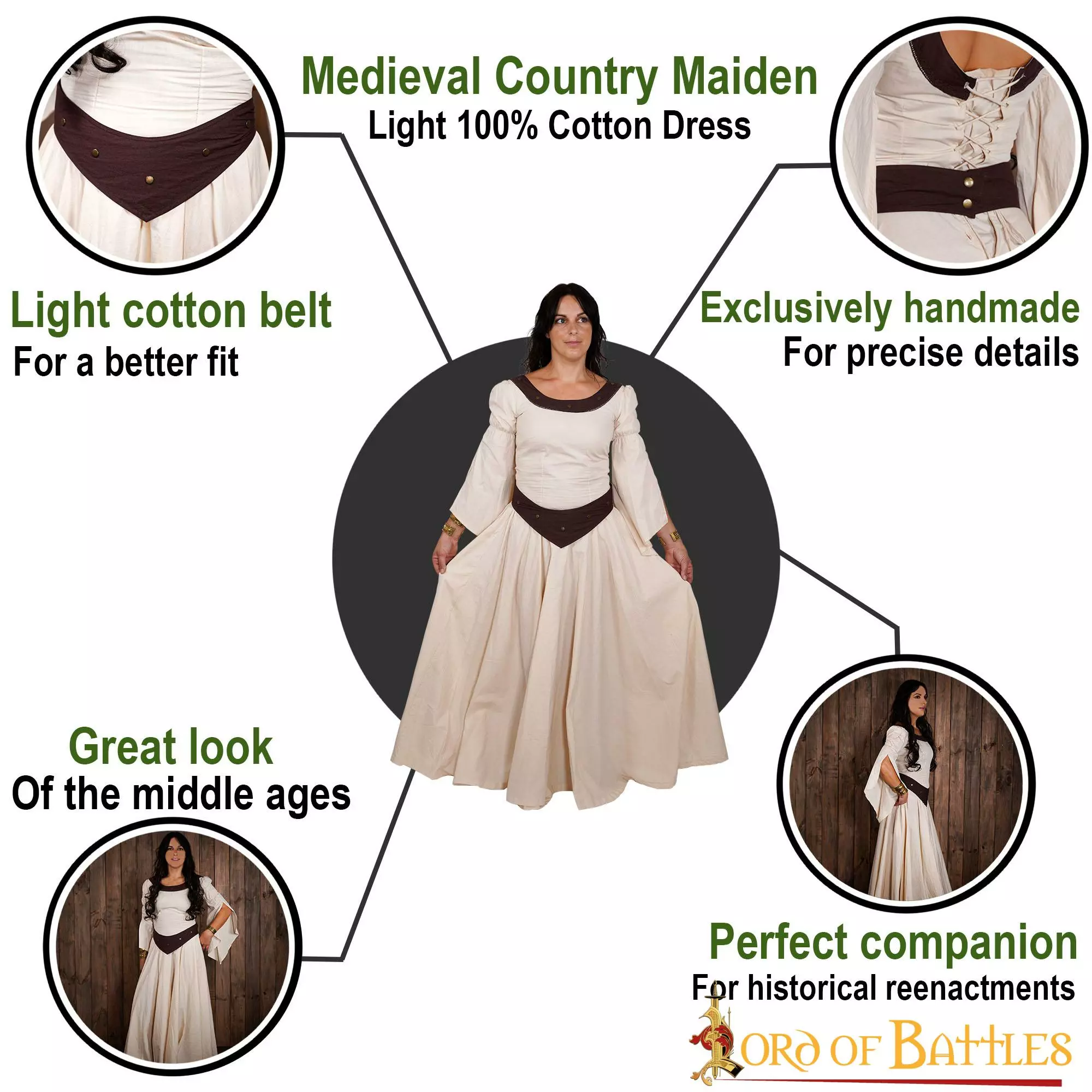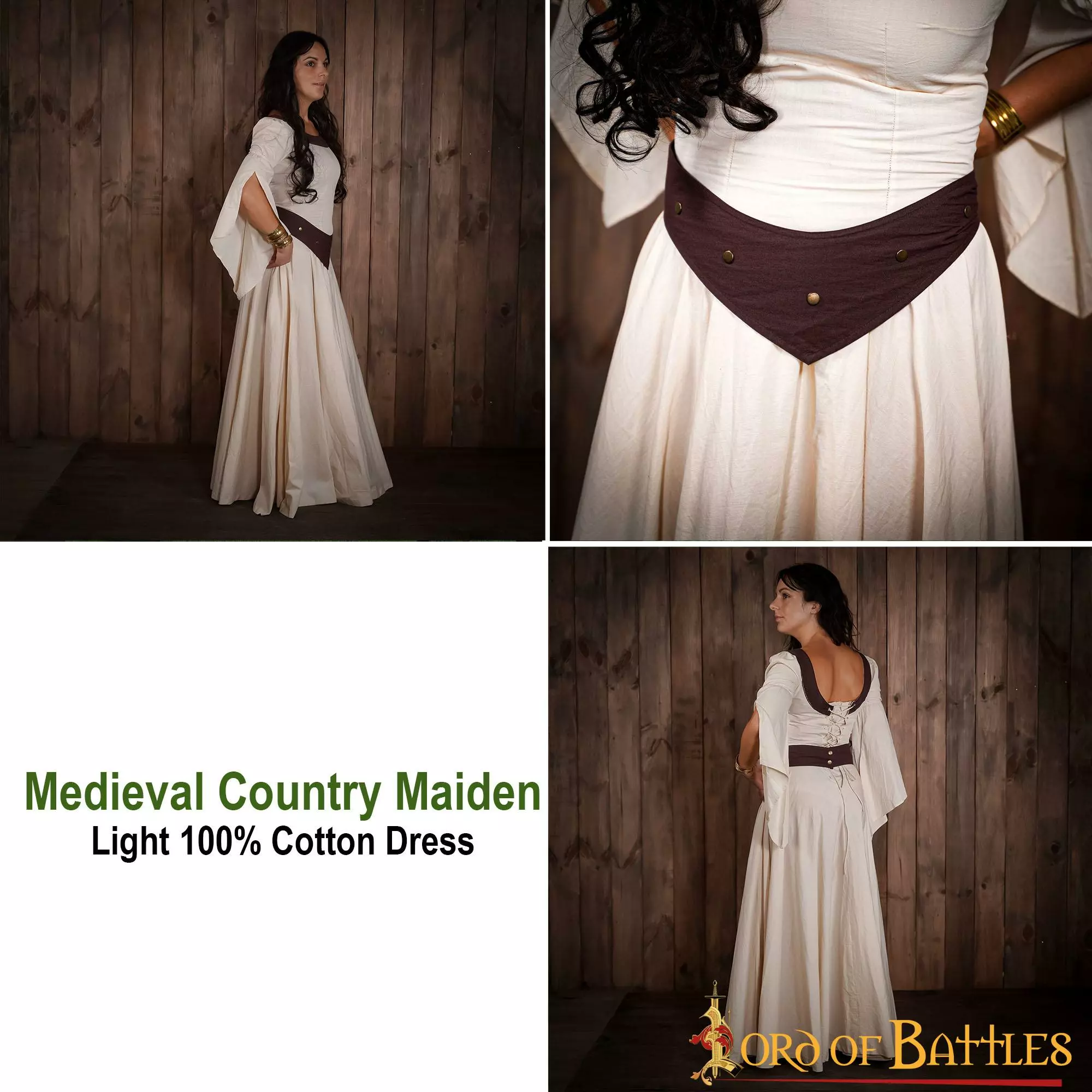 Confeccionado hábilmente por nuestros artesanos con algodón ligero 100%, no sólo proporciona una elegante fluidez al ponérselo, sino que también resulta cómodo de llevar en los calurosos días de verano. Para facilitarle la compra, le ofrecemos este vestido en las tallas pequeña, mediana, grande, extragrande y extragrande doble, para que pueda elegir la que mejor se adapte a sus necesidades (encontrará una tabla de tallas detallada junto a las fotografías). Para un mejor detalle medieval, este vestido se abrocha en la cintura con un cinturón de algodón marrón que se suministra con él.
